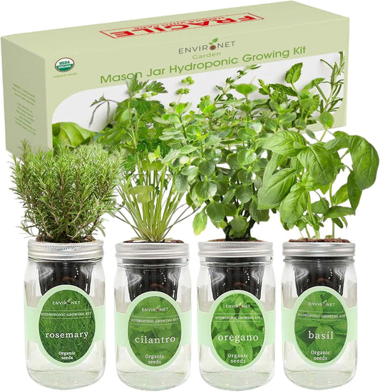 Hydroponic Mason Jar Organic Herb Seed Starter Kits - Mediterranean Herb Mix Growing Kits, Windowsill Herb Garden, Gardening Gift (Rosemary, Cilantro, Oregano, Basil)